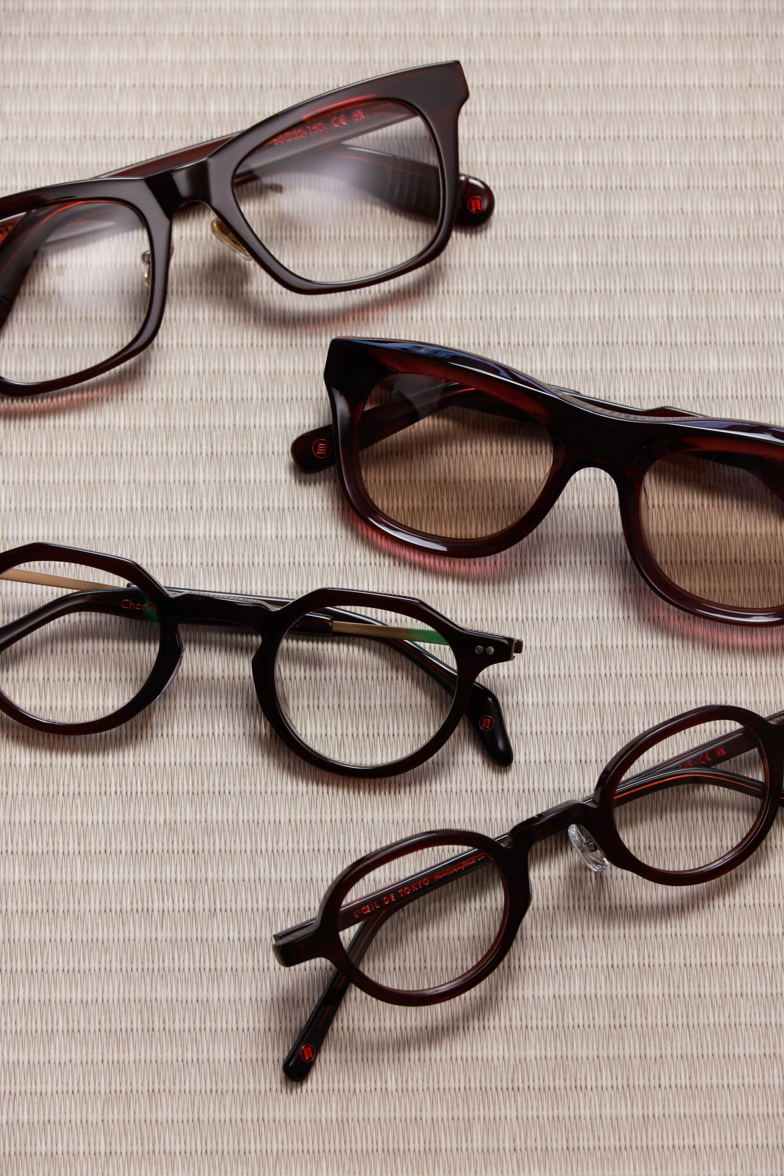 シグネチャーシリーズ、バーガンディカラーのアセテート。フランスと日本の影響が交差するデザインです。「赤い葉」「ワイン」「赤みがかったブラウン」とも呼ばれるこの色は、地平線に沈む夕日、胸に宿る情熱、そして秋にぶどう畑の葉が舞い落ちる情景を想起させます。